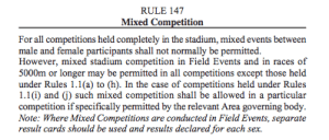 International Association of Athletic Federations rule 147, regarding mixed-gender competition: Generally not OK. Especially not OK in a stadium. Basically, if I’m reading this correctly, this rule is meant to foreclose the possibility that anyone might accidentally think that men and women compete directly against each other. Because then the earth might open up and swallow the stadium whole.